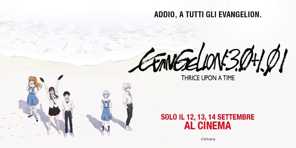 Le multisala che proietteranno EVANGELION 3.0+1.01 – Thrice Upon a Time dal 12 al 14 settembre alle 18:30 e alle 21:00 sono UCI Bicocca (MI), UCI Luxe Campi Bisenzio (FI), UCI Casoria (NA), UCI Montano Lucino (CO), UCI Firenze (FI), UCI Fiumara (GE), UCI Lissone (MB), UCI Cinepolis Marcianise (CE), UCI Luxe Marcon (VE), UCI Molfetta (BA), UCI Moncalieri (TO), UCI Orio (BG), UCI Parco Leonardo (RM), UCI Porta di Roma (RM), UCI Reggio Emilia (RE), UCI Romagna Savignano sul Rubicone (FC), UCI RomaEst (RM), UCI Torino Lingotto (TO), UCI Verona (VR).