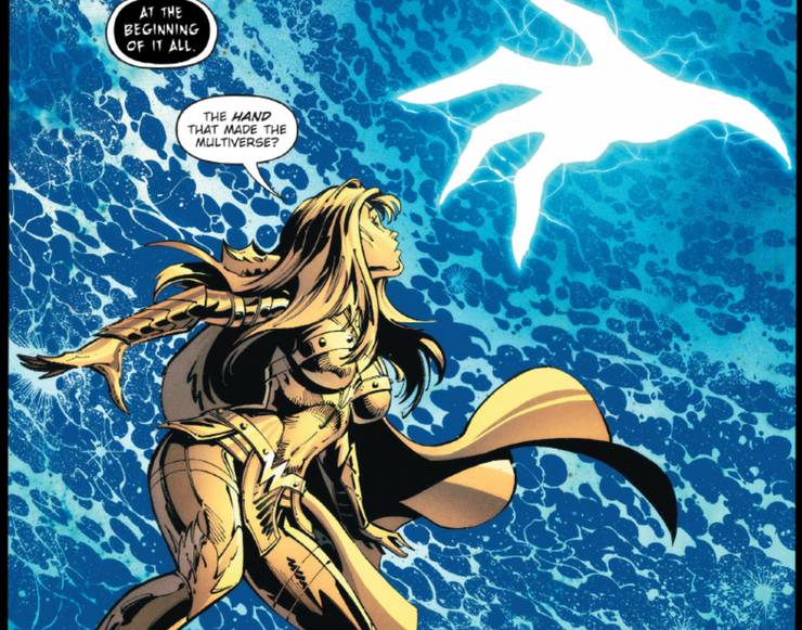 Nelle pagine successive si inizia a delineare il futuro dell’Universo DC. Diana si trova faccia a faccia con una Mano (che assume le sue sembianze) e che le spiega quale sarà il suo destino. Le entità sono adirate verso il multiverso che abbiamo sempre conosciuto. Tanti hanno cercato di stravolgere la realtà e di dominare l’universo, ma per fortuna c’è sempre stato qualcuno pronto a lottare per il bene. L’estremo sacrificio di Diana li ha così convinti a ricostruire il multiverso, ma con una differenza. Non c’è più né 1 sola Terra, né 52, ma un numero infinito di multiversi e di possibilità. Emerge così il concetto di Omniverso.