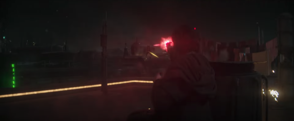 L’inquadratura precedente potrebbe, tuttavia, essere solo lo stesso Obi-Wan Kenobi che usa una pistola blaster DL-44. Poco dopo vediamo il Maestro Jedi, infatti, mentre è impegnato in uno scontro a fuoco sui tetti di Tatooine. In realtà c’è molta ironia nel vedere Obi-Wan usare un blaster, perché considerava quel tipo di armi come “incivili” – preferendo di gran lunga la sua spada laser. Tuttavia non vive in un tempo civile; inoltre, estrarre la sua spada laser lo tradirebbe, quindi è possibile che a questo punto stia ancora cercando di fingere di non essere un Jedi.