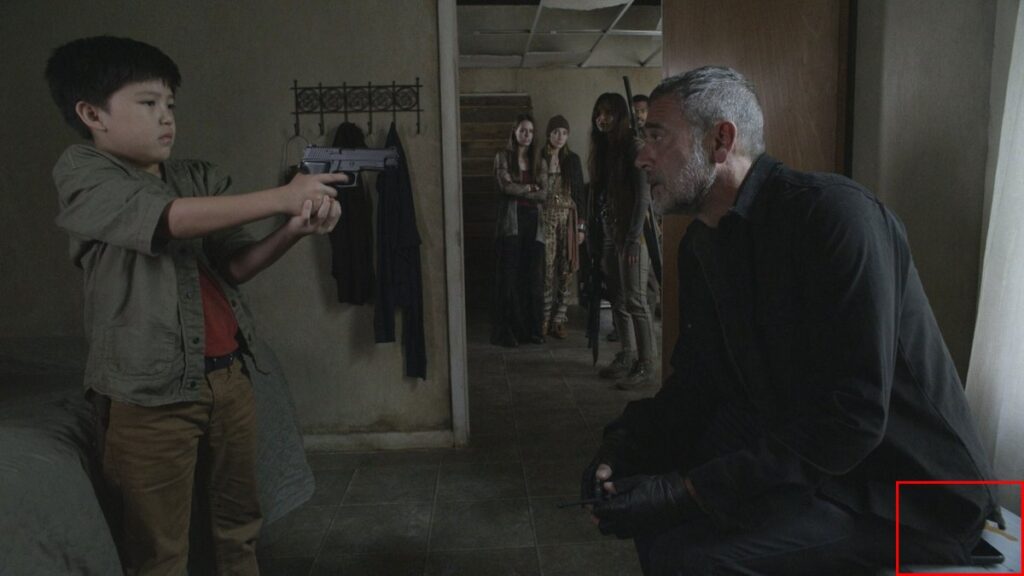 In “The Rotten Core”, infatti, è presente un moderno smartphone. Ben visibile quando il giovane Hershel Rhee (Kien Michael Spiller) punta una pistola contro Negan per aver ucciso suo padre, Glenn (Steven Yeun). Quando Negan si accovaccia per convincere Hershel a non sparare, alcuni fan hanno notato il telefono di Morgan che sbucava dalla sua tasca posteriore dei pantaloni. Ecco l’immagine e il tweet dell’attore: