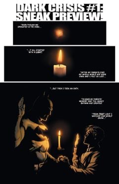 L’anteprima dell’edizione speciale di Dark Crisis #0 mostra eroi come Jon Kent/Superman, Wally West/The Flash e altri combattere una miriade di nemici che altrimenti sarebbero stati gestiti dalla Justice League. L’ultima pagina dell’anteprima mostra Nightwing/Dick Grayson che commemora la Justice League a una veglia a lume di candela fuori dalla Hall of Justice. “Superman, Batman, Wonder Woman, John Stewart, Green Arrow, Black Canary, Aquaman, Hawkgirl e Martian Manhunter“, dice alla folla. “Non potreste mai mettere in dubbio ciò che rappresentavano. Cosa significavano per il mondo. So che per molti di voi qui oggi erano più che semplici mentori. Erano padri, madri, amici… una famiglia. Ci saranno giorni difficili davanti a noi, ma vi prometto che se lavoreremo insieme, la speranza alimenterà la luce che ci spinge attraverso questa oscurità proprio come quella candela il giorno in cui ho prestato giuramento”.