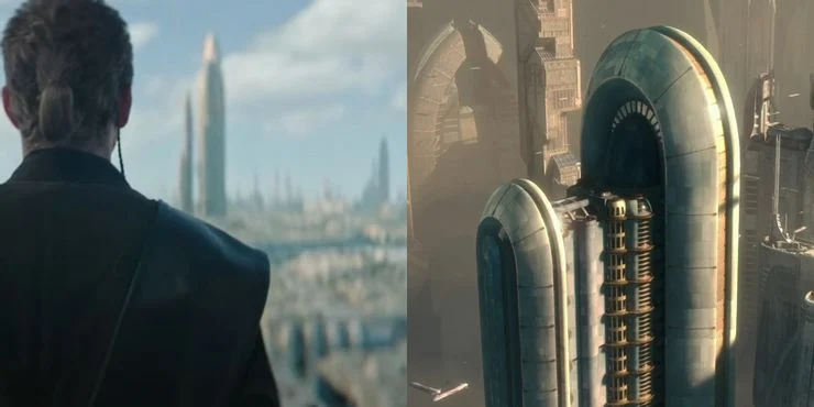 Le scene dei flashback sono ambientate su Coruscant durante la Guerra dei Cloni. Quando incontriamo Anakin per la prima volta, lo vediamo di spalle intento a guardare verso un grattacielo che ricorda il palazzo dove risiede Padmé in Star Wars: Episodio II – L’attacco dei cloni. La somiglianza non è esatta, ma è abbastanza vicina (e abbastanza significativa) da essere presa in considerazione.