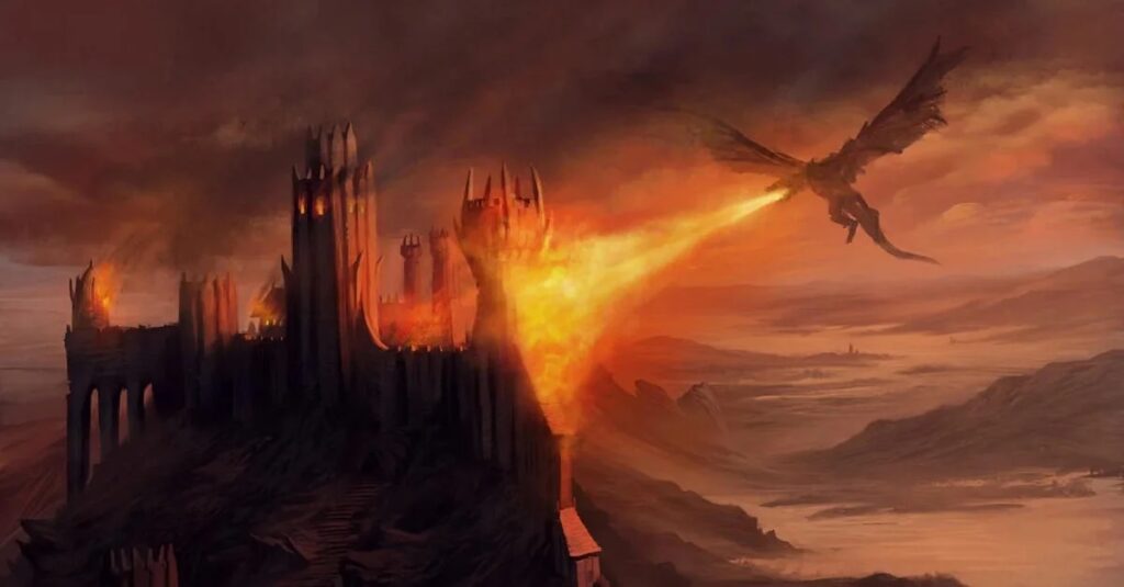 SPOILER: nell’episodio 6 della House of the Dragon, “La Regina e la Principessa“, il segreto della relazione della Principessa Rheanyra con il figlio di Ser Lyonel Strong (e Capitano della Guardia Cittadina), Ser Harwin Strong, inizia a svelarsi con la nascita del loro terzo figlio. Quando la corte inizia a mormorare apertamente che i figli di Rhaenyra sono bastardi e non veri eredi reali, Ser Harwin viene esiliato con vergogna a Harrenhal insieme al padre. Apprendiamo che l’altro figlio di ser Lyonel, Larys “Piede di bastone” Strong, cospira con alcuni sicari per appiccare il fuoco a Harrenhal, uccidendo il padre e il fratello. Il misterioso incendio di Harrenhal non farà altro che rafforzare la leggenda della maledizione, fino al periodo di Game of Thrones, quasi 200 anni dopo.