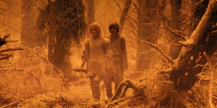 Galadriel si risveglia ricoperta di fuliggine e cenere, con il villaggio in cui si trovavano i suoi alleati completamente devastato e bruciato dall’eruzione infuocata. Isildur e Miriel iniziano a salvare i sopravvissuti che riescono a trovare tra le macerie della città, ma il crollo di un edificio acceca Miriel e lascia Isildur presunto morto mentre tutti evacuano il territorio. Galadriel e Theo vengono separati dagli altri mentre cercano i loro amici e familiari, e Galadriel alla fine rivela al ragazzo di aver perso il fratello e il marito mentre i due riposavano.