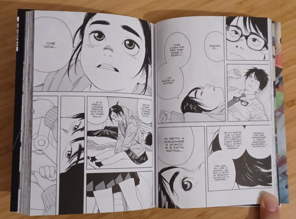 In Insomniacs After School Ojiro è riuscito a creare un’atmosfera coinvolgente grazie a delle tavole in cui non c’è alcun dialogo, ma dove i disegni e la comunicazione non verbale tra i personaggi la fanno da padrona. I due protagonisti Ganta e Isaki sono personaggi simpatici e ben caratterizzati, e nonostante di loro non ci venga detto molto, questo primo volume riesce a farci provare interesse nei confronti di quello che stanno passando e dà anche qualche piccolo indizio sugli sviluppi futuri. Le loro avventure quotidiane incuriosiscono in certi momenti anche sulle cause che hanno portato alla loro condizione. La serie riesce a farti domandare se le loro notti insonni nascondano in realtà un risvolto futuro drammatico.