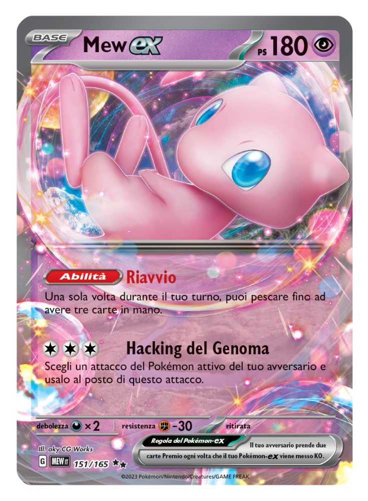 • Collezione ultra premium dell’espansione Scarlatto e Violetto – 151 (disponibile il 6 ottobre 2023), che include 16 buste di questa espansione, una carta rara iper in metallo di Mew-ex, una carta promozionale rara illustrazione speciale di Mew-ex, una carta promozionale rara illustrazione di Mewtwo, un tabellone di gioco con bordi impunturati di Mew, un portamazzo, una moneta di Mew e vari accessori di gioco.