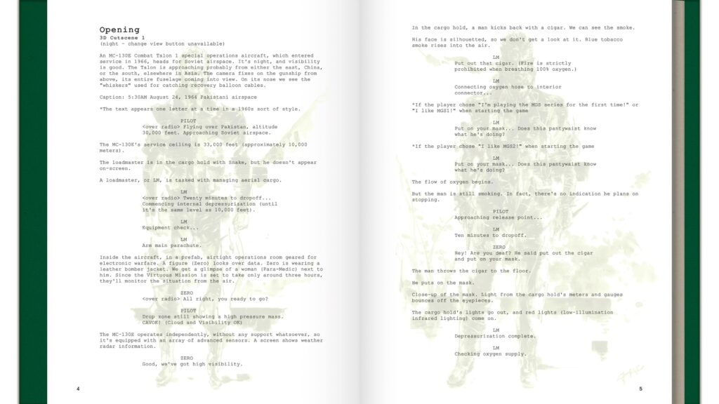 Lo Screenplay Book, invece, è una raccolta maniacale di tutte le battute presenti nel determinato gioco su cui lo abbiamo avviato. Viene, infatti, descritta la scena che vediamo giocare con le battute tra i personaggi coinvolti e prosegue per tutto il gioco coinvolto. Ci troviamo, dunque, con un libro che può passare benissimo le 900 pagine e, ciliegina sulla torta, sono state estratte tutte le chiamate codec e trascritte su queste pagine.