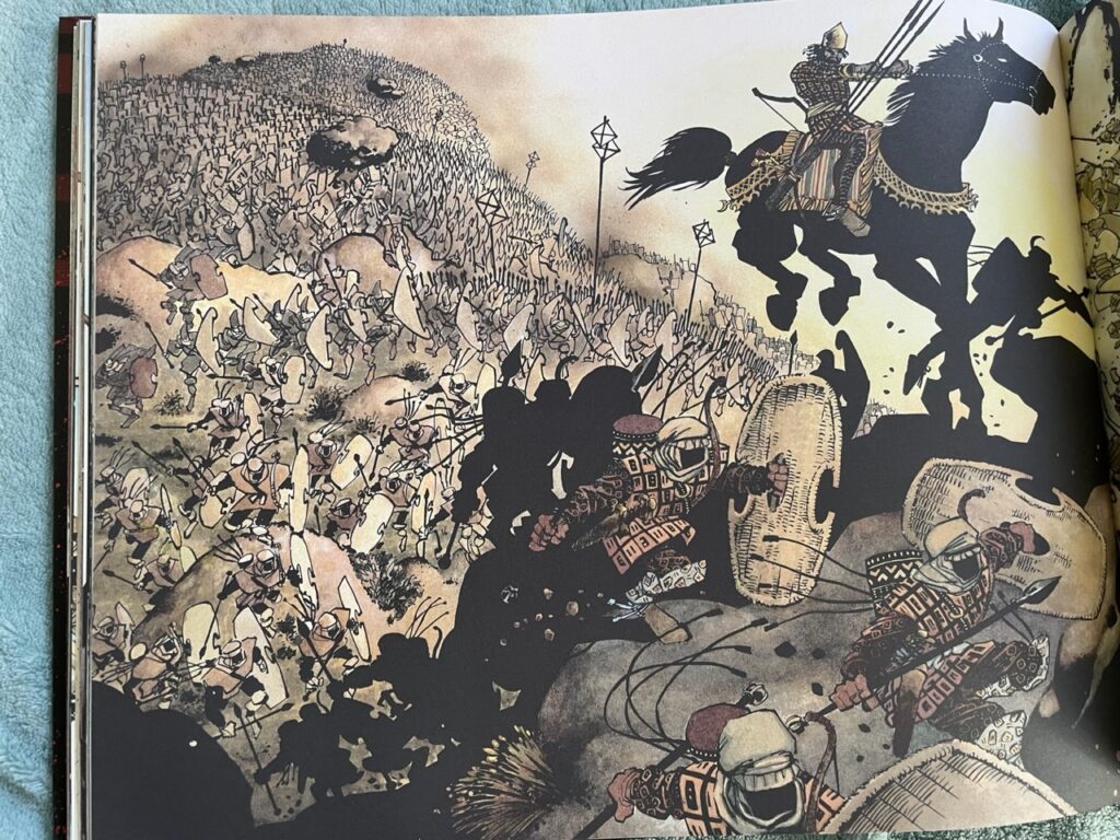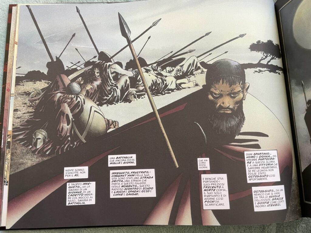 I due condottieri avranno occasione di confrontarsi e di mettere in luce i loro ideali, ma lo scontro tra persiani e spartani prende vita soprattutto attraverso battaglie all’ultimo sangue tra i due eserciti, che Frank Miller raffigura in tutta la loro brutalità ed efferatezza. Il formato orizzontale gli permette di realizzare una lunga sequenza di pagine che esaltano lo stile iconico del disegnatore e nelle quali si alternano scene piuttosto fitte di dialoghi e didascalie a scene silenziose dove è solo il sangue a parlare.