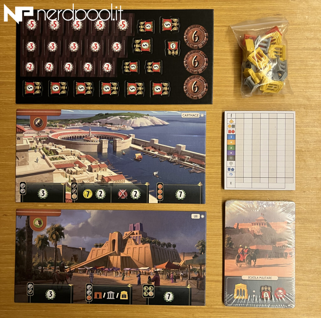 2 plance della Meraviglia, 15 carte Struttura, 24 gettoni Partecipazione, 15 segnalini Debito, 3 Monete, 12 segnalini Conflitto Militare, 1 blocchetto segnapunti, 3 schede Descrizione dei Nuovi Effetti, 1 regolamento.