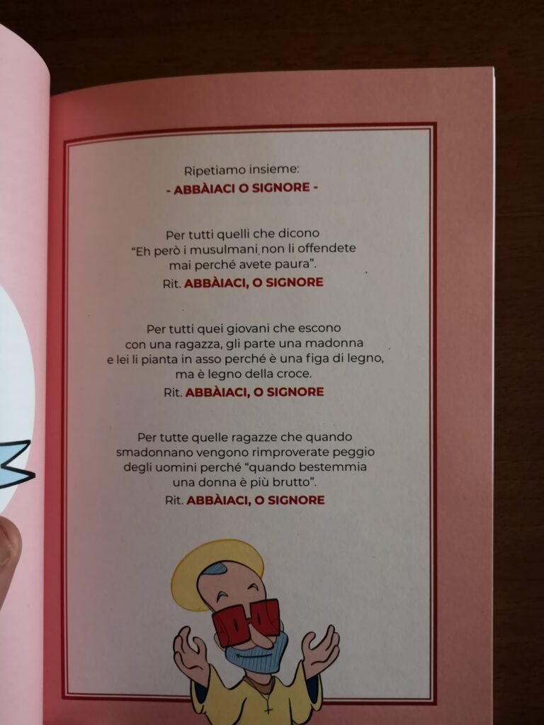Le bestemmie sono il filo conduttore di ogni storia, quell’essere fantasioso che nell’immaginario collettivo dei bigotti tutto vede e tutto può, è lo zimbello da prendere in giro. Esattamente come le persone che lo venerano e che cercano di farti cambiare idea, o che usano quei modi di dire antiquati, tipo quando ringraziano il signore per una gentilezza che TU hai fatti nei loro confronti.