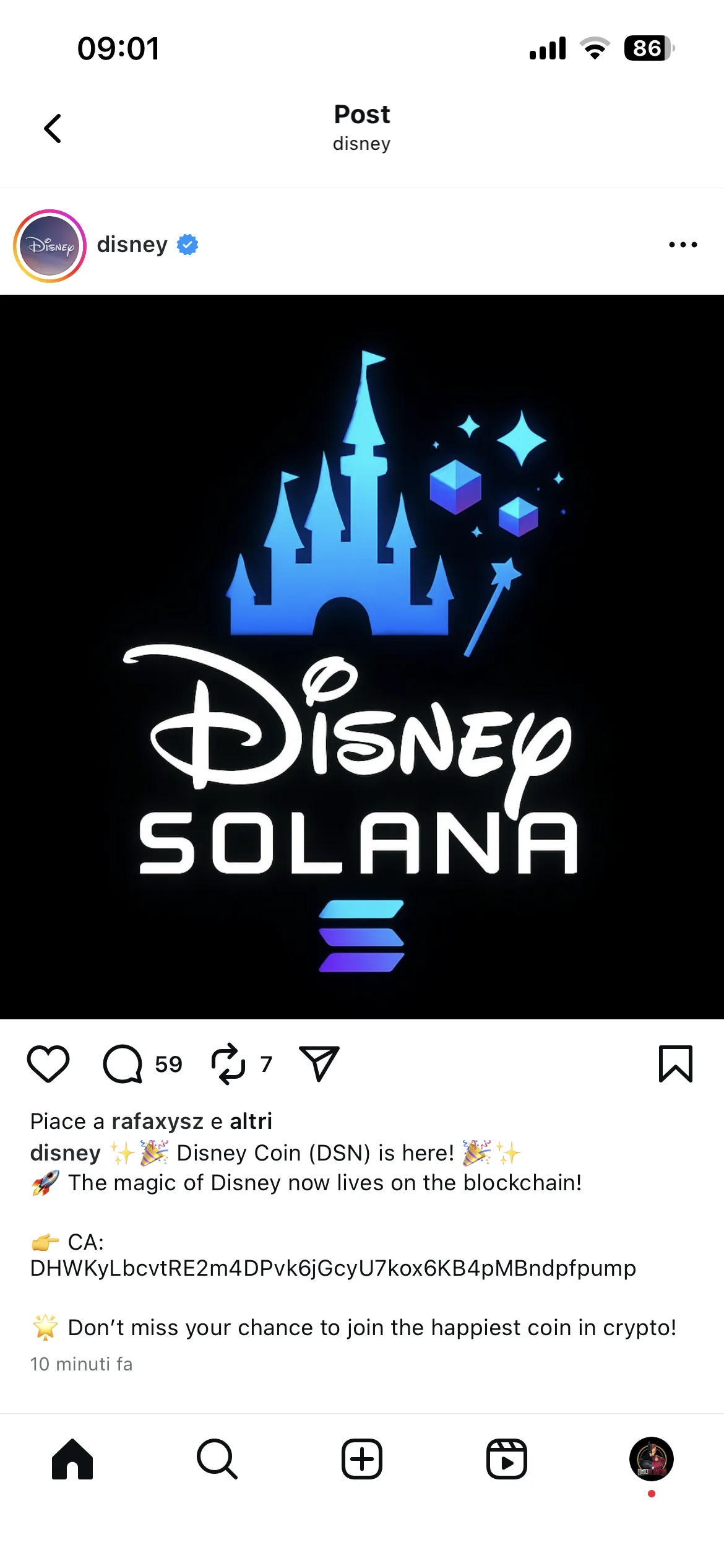 Nelle ultime ore l’account ufficiale Instagram di Disney è stato vittima di un attacco hacker. Alcuni post e stories, infatti, hanno pubblicizzato una presunta criptovaluta chiamata Disney Coin (DSN), legata alla blockchain di Solana.