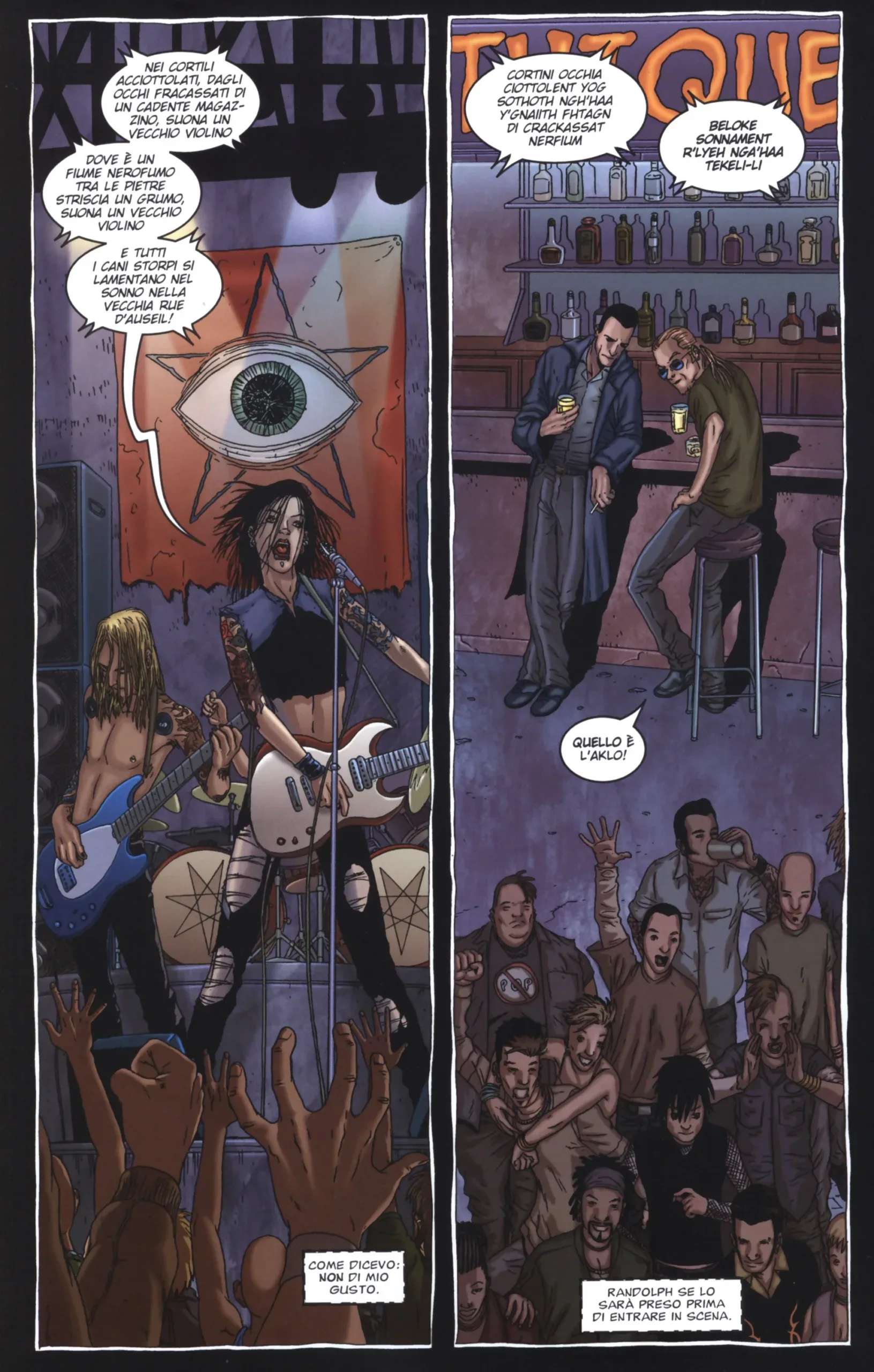 Neonomicon, scritto da Moore dopo aver visto l’adattamento di Johnston, riprende le fila esattamente da dove si interrompe Il Cortile: la discesa verso la follia che si nota nella prima storia colpisce infatti Aldo Sax, che oltre ad avere degli episodi psicotici riconducibili alla serie di omicidi del primo volume, si esprime esclusivamente usando l’Aklo (la lingua artificiale creata da Arthur Machen e resa poi celebre da H. P. Lovecraft nel suo ciclo del Mito di Cthulhu), richiedendo quindi che due nuovi agenti subentrino nel caso e cerchino di svelare il mistero legato a questi omicidi rituali che tanto condividono con le opere di Lovecraft (riferimento questo non meramente extra-testuale ma usato attivamente da Moore all’interno del fumetto, con riferimenti a opere specifiche citate dai protagonisti). La seconda storia prosegue quindi dal finale della prima ma scava molto di più nell’immaginario di Lovecraft, con l’apice raggiunto nella seconda metà del volume. Per i contenuti grafici, la lettura sicuramente non è adatta a tutti, con vette horror che sfociano in momenti di pura violenza carnale e non, legando a doppio filo il mondo degli Antichi con quello che noi tutti conosciamo.