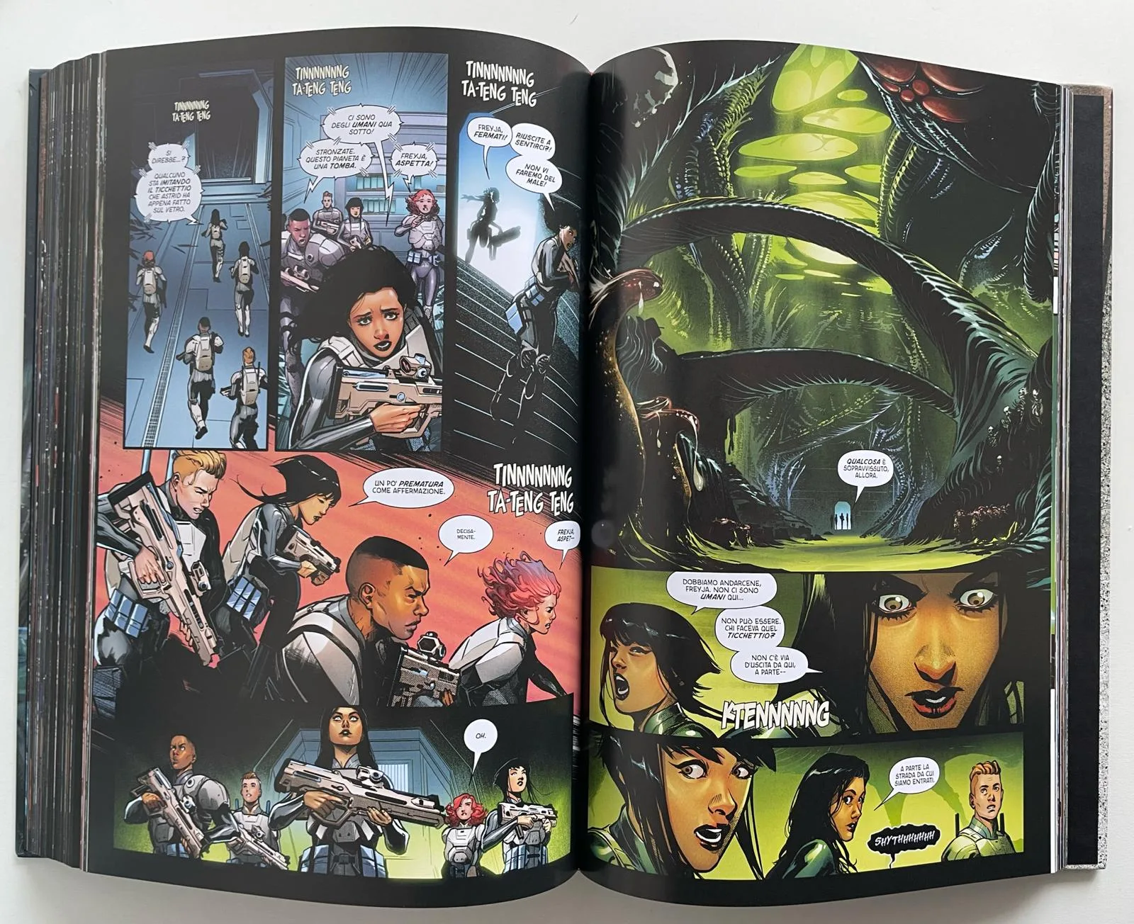 Già in questo primo arco narrativo si percepisce il terrore assoluto trasmesso dagli xenomorfi e la sensazione di essere inermi provata da qualsiasi essere umano che si trovi sul loro cammino. Salvador Larroca è il disegnatore scelto per questa storia e la successiva e il suo tratto è perfetto soprattutto nel raffigurare le creature aliene e l’atmosfera di tensione vissuta nell’astronave, dove tutto è cupo e pieno di ombre, grazie anche ai colori di Guru-eFx.