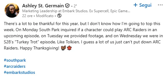 Dopo aver inviato a South Park un filmato del gioco da utilizzare il giorno seguente, Arc Raiders è apparso mercoledì nell’episodio “Turkey Trot” della 28esima stagione.