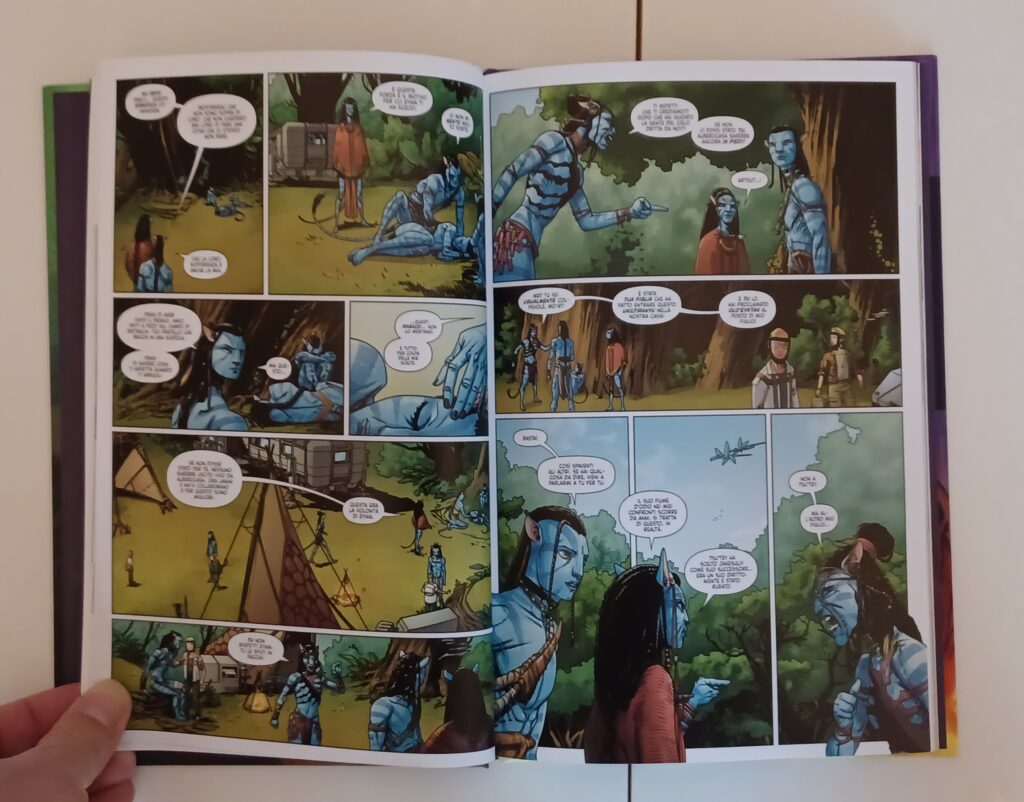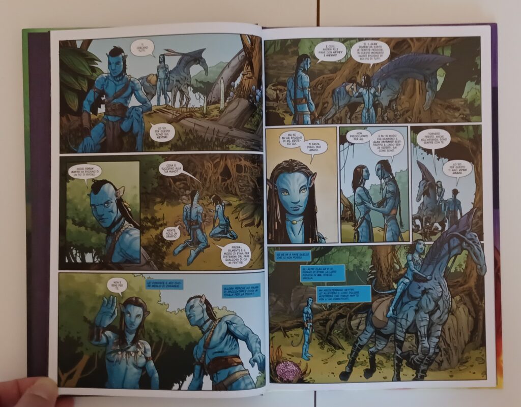 Molto bello è anche il carattere spirituale di questa storia, in quanto Jake, in forma di spirito, parla con Tsu’tey e vede un po’ delle sue lotte. Questa è stata sicuramente la storia più spirituale che abbiamo avuto finora nei fumetti. Quella raccontata in questo volume è la storia con il ritmo migliore tra quelle pubblicate finora. C’è praticamente tutto quello che piace di Avatar. Molto bello è anche il modo in cui alcune piccole cose qui preparano eventi che si collegano a La Via dell’Acqua, in particolare l’inizio, prima del ritorno degli Umani.