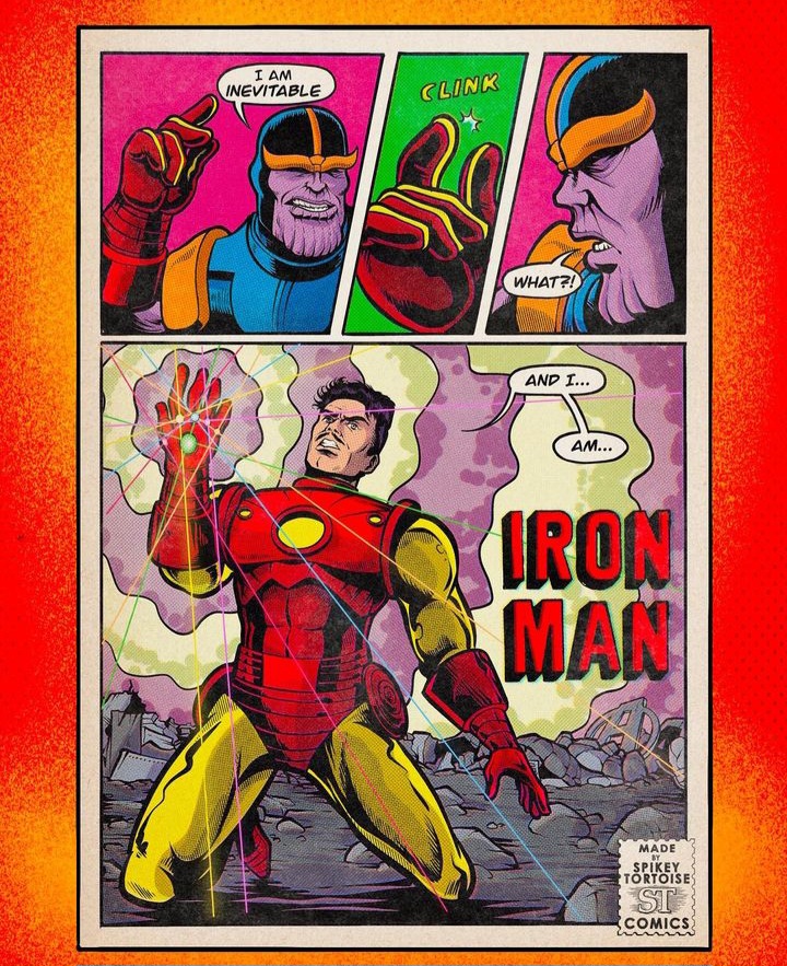 Su Instagram, l’artista Ian Wilkins, che si fa chiamare @spikeytortoisecomics, ha condiviso un’illustrazione creata dai fan che reimmagina l’iconico momento del Marvel Cinematic Universe in un classico stile Marvel Comics. Secondo Wilkins, l’illustrazione è in realtà un’altra ripresa di un pezzo di una pagina che ha realizzato tre anni fa, questa volta aggiungendo pannelli della reazione di Thanos al furto delle Pietre dell’Infinito e dando ad Iron Man un aspetto più dinamico. Tuttavia, l’aspetto dell’eroe e del cattivo non è stato realizzato in modo da corrispondere strettamente alle loro controparti del MCU, ma a come apparivano nei primi anni della Marvel Comics.