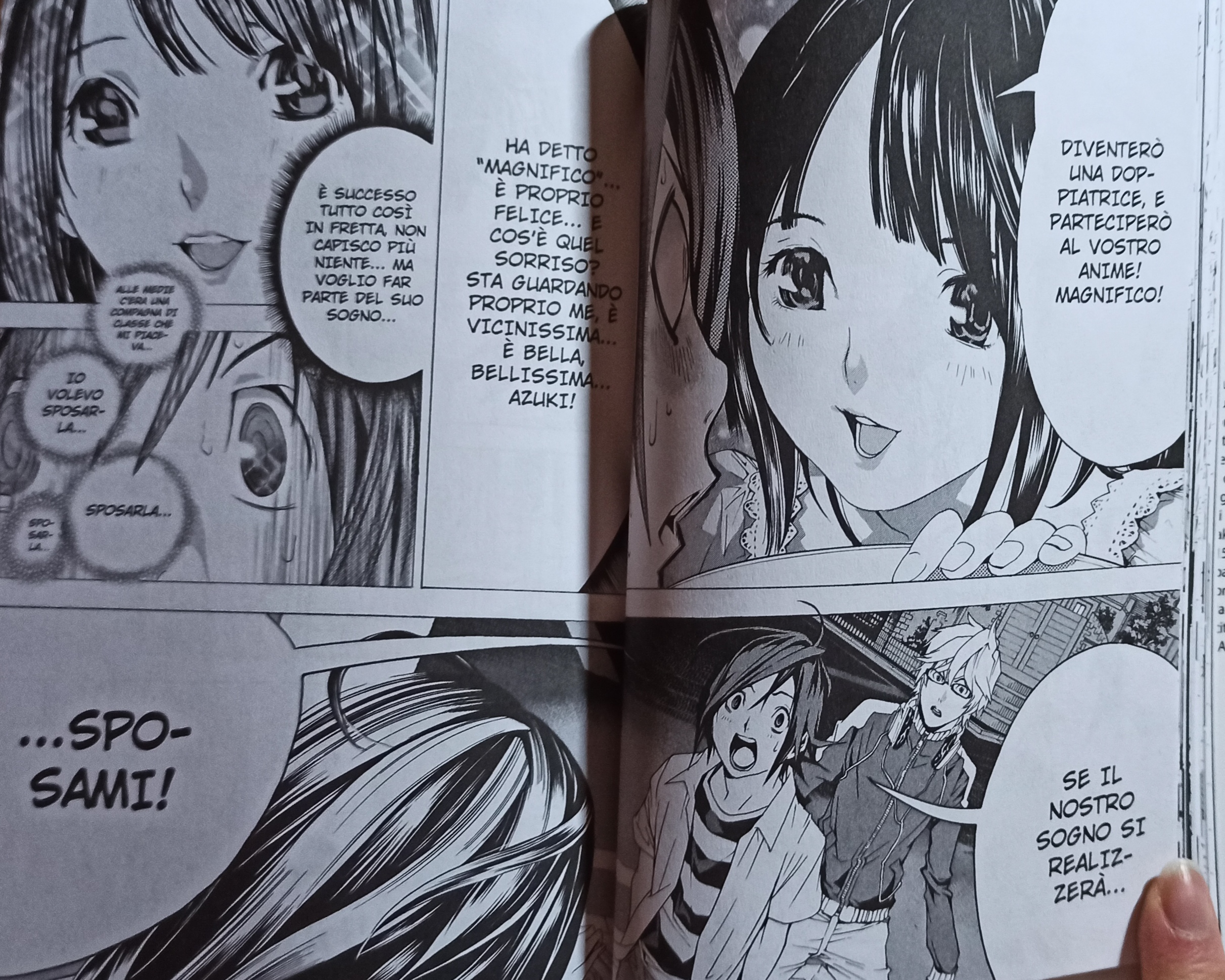 I due sognatori cominciano così a lavorare in modo estenuante insieme, andando contro le proprie preoccupazioni e quelle dei loro familiari preoccupati per il loro futuro, dato che, il mestiere del mangaka è sempre incerto, riflettendo esattamente il funzionamento del “gioco d’azzardo” secondo le parole dello zio di Mashiro. Ogni sogno comporta dei rischi, lo sapeva suo zio Taro Kawaguchi e lo sa anche Mashiro, ma quest’ultimo ha fortunatamente (perché ci vuole anche fortuna secondo le regole di Taro), più possibilità dato che possiede già uno studio, e persone care che bene o male cercano di credere in lui, ma soprattutto l’amore. Perché Mashiro decide di mettere tutto se stesso nel suo progetto insieme a Takagi soltanto quando si dichiara alla ragazza per cui ha una cotta: Miho Azuki.