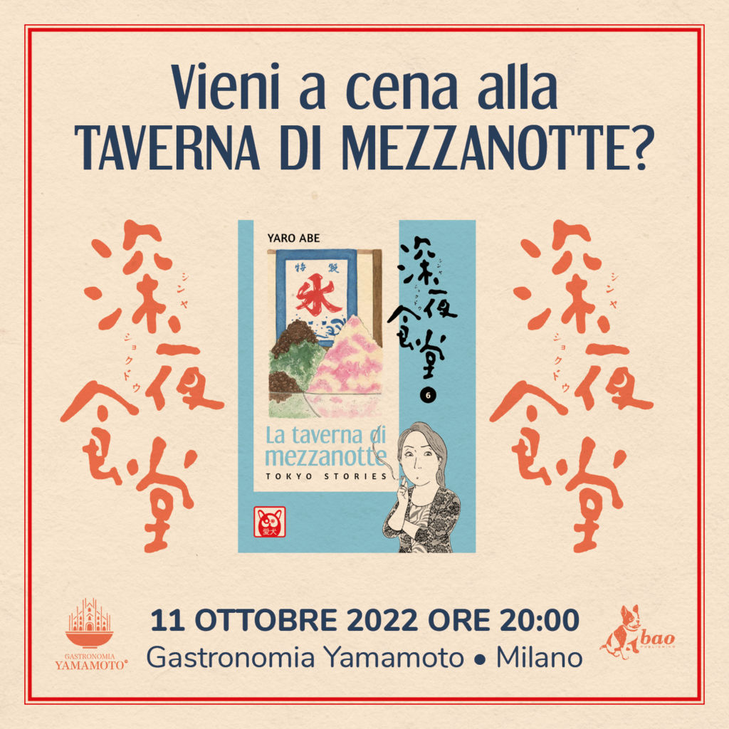 Sedetevi al banco e ordinate quel che volete. A volte gli ingredienti vanno portati da casa, ma alla taverna le storie arrivano sempre da sole, da mezzanotte all’alba, pronte a farsi ascoltare tra un boccone e l’altro. In occasione dell’uscita del nuovo volume, l’11 ottobre a Milano una cena evento ispirata al manga di Yaro Abe. Una serata speciale organizzata da Gastronomia Yamamoto con BAO Publishing.