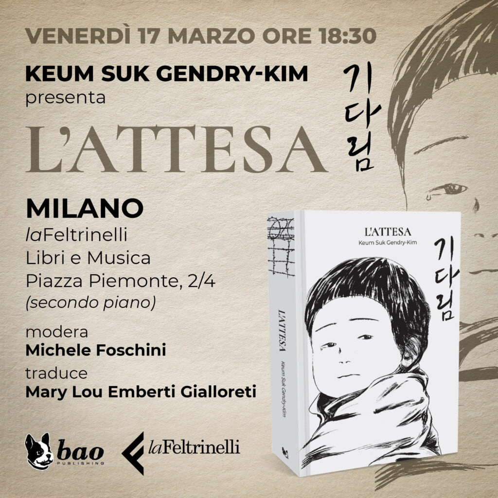 Keum Suk Gendry-Kim presenterà il graphic novel “L’attesa” a Milano il 17 marzo, giorno dell’uscita, presso la libreria la Feltrinelli di Piazza Piemonte 2/4 alle ore 18:30, secondo piano. Ingresso libero.