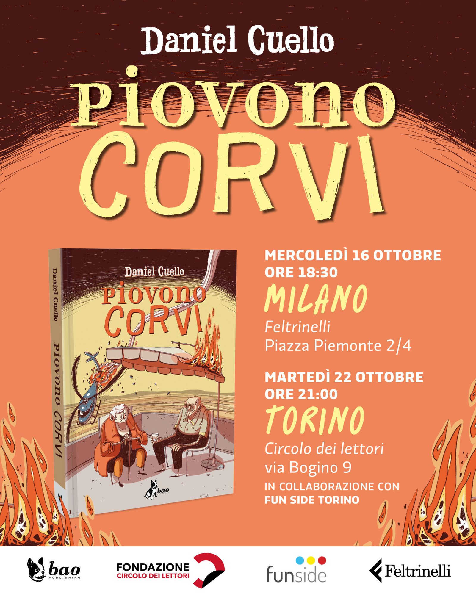 Daniel Cuello è un fumettista un po’ argentino, un po’ italiano, un po’ nessuna delle due cose. Nel suo sangue ci sono almeno sette culture diverse. Autodidatta, da anni pubblica graphic novel, racconti brevi, illustrazioni e tante, tantissime vignette, molte delle quali raccolte nel volume Guardati dal beluga magico pubblicato da BAO Publishing nel 2018. Residenza Arcadia, il suo primo romanzo grafico edito da BAO Publishing nel 2017, ottiene un enorme successo di pubblico e di critica. Nel 2019, sempre per i tipi di BAO, pubblica il suo secondo graphic novel, Mercedes, vicitore del Premio Micheluzzi per il miglior Fumetto al Napoli Comicon 2020. Nel 2022 esce Le buone maniere, vincitore del Gran Premio Romics 2023. Ha collaborato con varie testate e case editrici come Baldini+Castoldi, Linus, Becco Giallo, DeAgostini, Longanesi, Treccani, Jacobin Italia, Corriere della Sera, Revue Dessinée, Melagrana e molte altre. Ma soprattutto è comparso più volte tra i quiz della Settimana Enigmistica. E questo è un enorme traguardo. Piovono Corvi è il suo quarto graphic novel.
