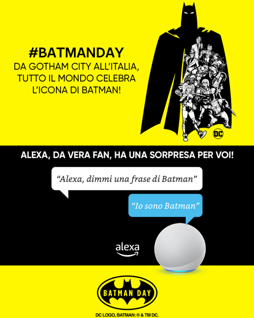 Batman ha fans in tutto il mondo, e tra questi troviamo anche Alexa! In occasione del Batman Day in tutti i dispositivi Alexa in Italia sarà possibile ascoltare la voce del Cavaliere Oscuro, interpretato da Luca Ward (Batman in DC League of Super-Pets – al cinema dall’1 Settembre 2022). Basterà chiedere “Alexa, dimmi una frase di Batman” per essere catapultato nell’immaginario di questa incredibile icona. Batman sarà inoltre presente anche sugli schermi dei dispositivi Alexa, con una creatività sviluppata appositamente per l’anniversario, che accende i riflettori sul Pipistrello e su tutti gli avversari che ha dovuto affrontare nella sua carriera di vigilante a Gotham City.