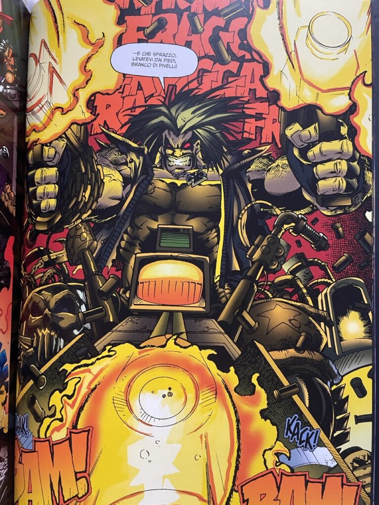 Come vi accennavo, nell’ultima storia del volume non è presente Batman, ma Lobo. Lo scorretto e violento cacciatore di taglie, durante un lavoro, si trova a proteggere un mutaforma ricercato da alcuni mutanti di Mega-City One. Lobo esce sconfitto dal primo scontro ma, attraverso la cintura dimensionale, decide di seguirli per capire cosa sta succedendo e ottenere la sua vendetta. Il suo arrivo non passerà inosservato agli occhi del Giudice Dredd, che vuole catturarlo. Inizierà così un violento scontro tra le tre parti, ognuna disposta a tutto per raggiungere il proprio scopo.