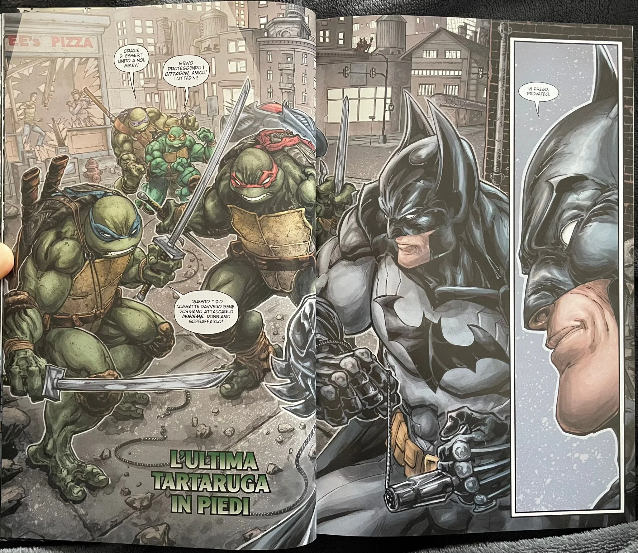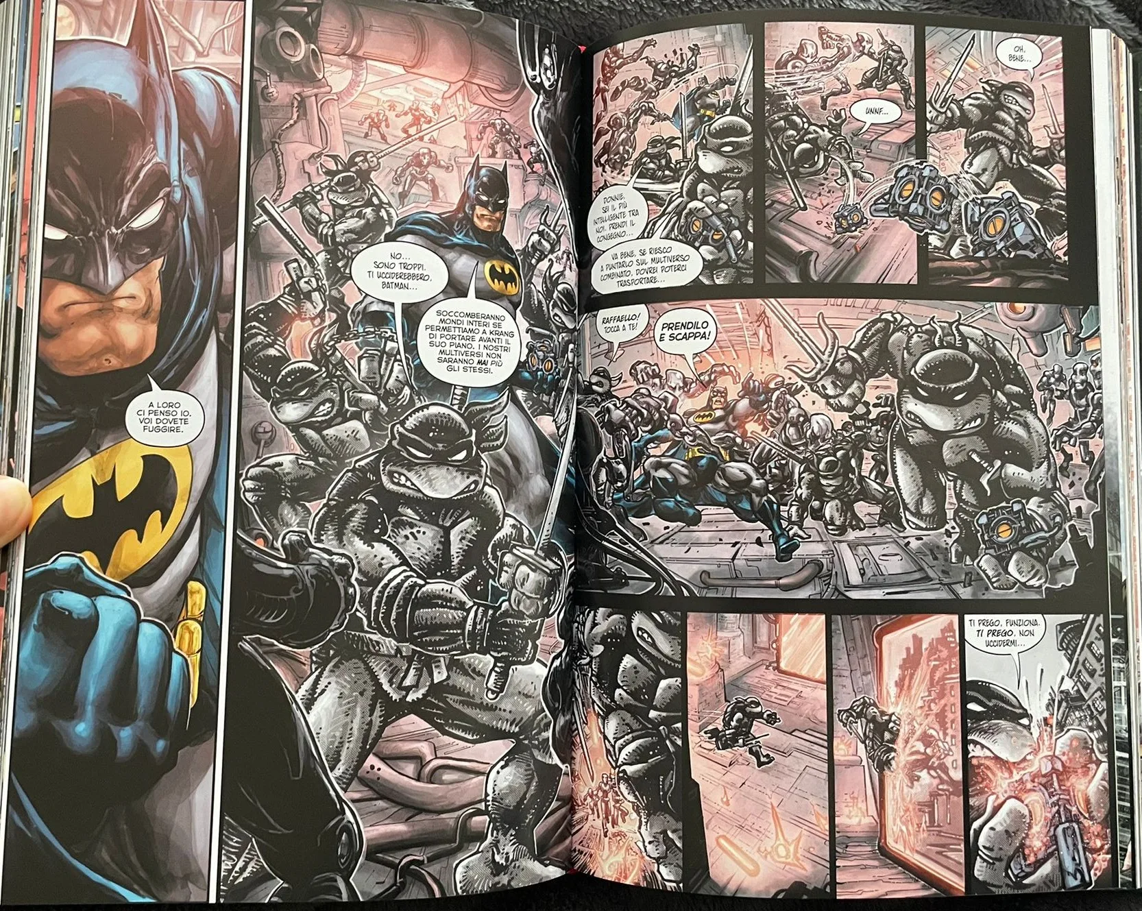 Il team creativo chiude così il cerchio con un’avventura che è l’omaggio perfetto a entrambi i mondi narrativi. Da una parte, la storia richiama sia la Golden Age di Batman che l’evento più famoso e importante per l’Universo DC, ovvero Crisi sulle Terre Infinite del 1985, e tutte quelle “Crisi” che, in modo ricorrente, intervengono sulla continuity della DC Comics per riscriverla. Al contempo, come anticipato, in questa vicenda avranno un ruolo centrale le TMNT originali, create da Kevin Eastman e Peter Laird nel 1984 per Mirage Studios. La prima serie a fumetti era infatti in bianco e nero e aveva un tono un po’ più maturo rispetto alla direzione che il franchise ha preso poi più avanti, pur mantenendone gli elementi caratteristici. Se volete recuperarle le trovate nei volumi della Classic Collection che Panini sta pubblicando in questi mesi.
