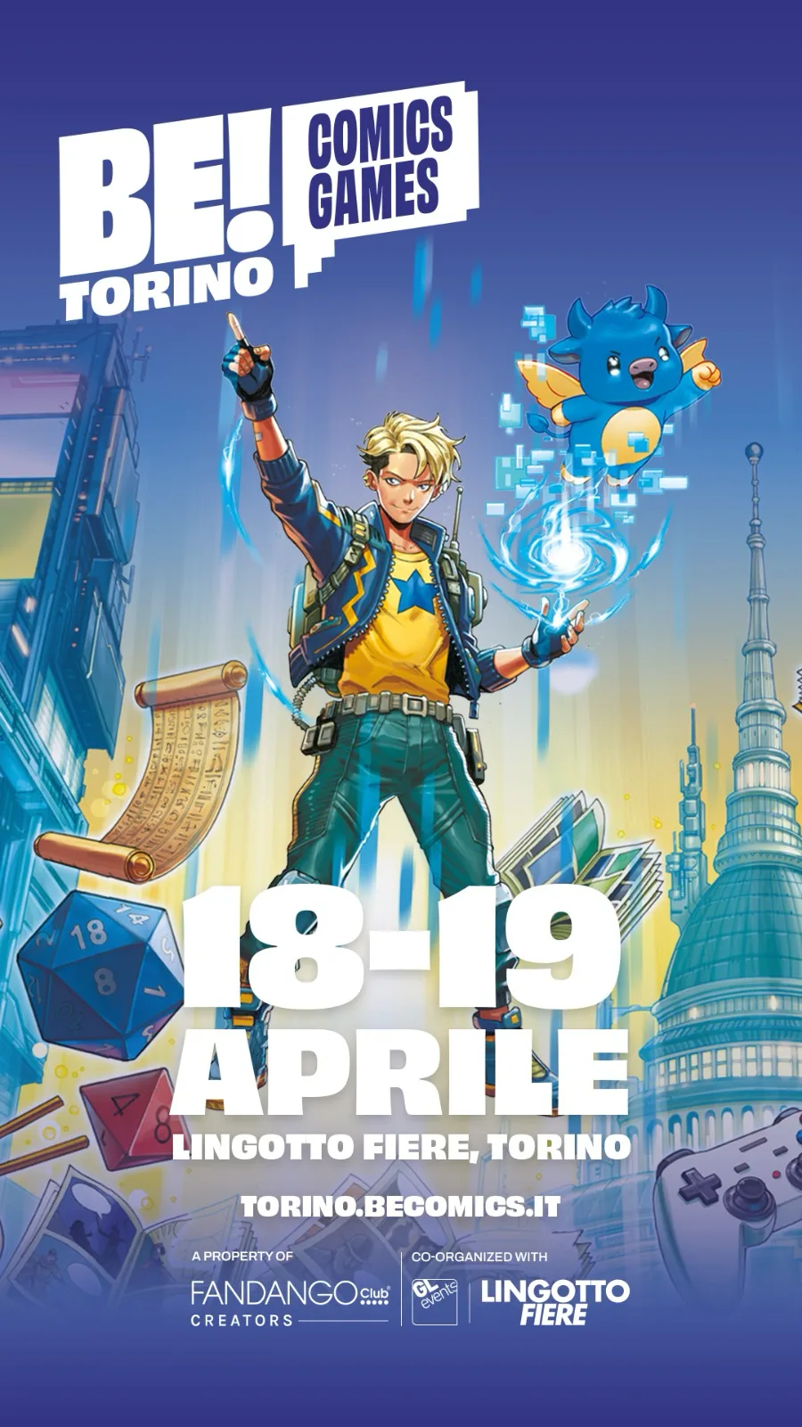 Per inaugurare la manifestazione, la cura della visual identity è stata affidata al fumettista Andrea Broccardo: torinese di nascita e di formazione, si è affermato come una delle matite più versatili e richieste di Marvel Comics, per la quale ha lavorato a testate di primo piano comeStar Wars: The High Republic, The Amazing Spider-Man, Spider-Man Noir (miniserie scritta dal leggendario Erik Larsen). Il poster che ha disegnato racchiude tutta l’essenza crossmediale del festival. Broccardo attinge soprattutto all’estetica manga, rappresentando un ragazzo (vestito di blu e giallo, i colori di Torino) che evoca elementi iconici della pop culture – joypad, fumetti, dadi da gioco di ruolo, carte collezionabili – insieme a un toro in stile “chibi”, tipico del fumetto giapponese, come richiamo alla città. Sullo sfondo, il capoluogo sabaudo è reinterpretato in chiave cyberpunk, attraverso uno skyline in cui si incontrano la Mole e grattacieli futuristici.