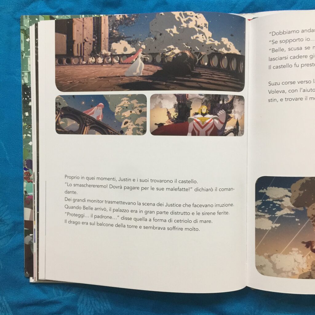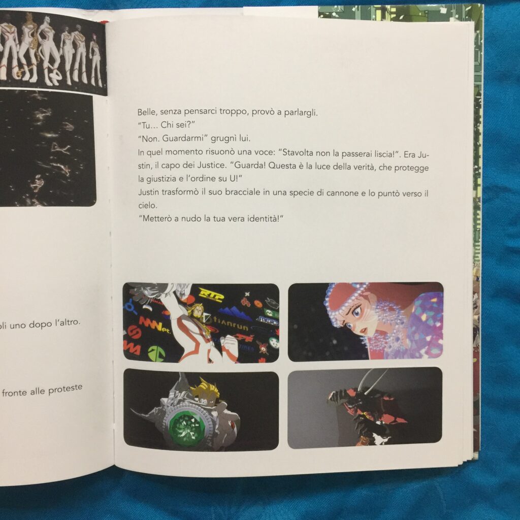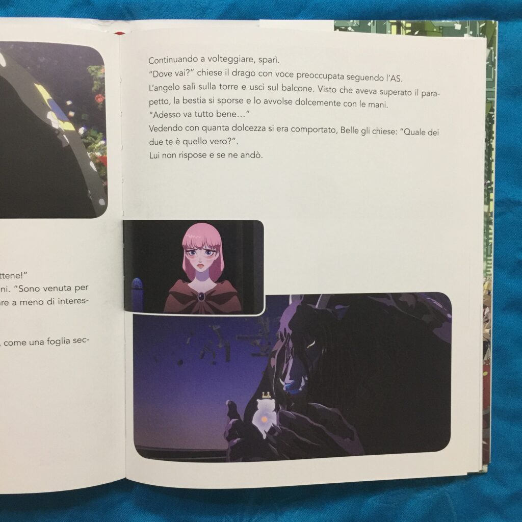 Non possiamo però tralasciare anche Belle Anime Book, un volume dal grande formato (21 X 25) e completamente a colori dove troviamo la storia in breve pur con diversi dialoghi accompagnata dalle immagini del film. Alcune riempiono la pagina nella sua interezza, altre sono più piccole ma che mostrano diversi momenti del film anche dettagli che non si notano ad una prima visione. Con i suoi colori vibranti si può ammirare l’immaginario di U e il lato più visual del film che rivive in queste pagine. Anche qui la qualità della carta lucida è molto buono e questo volume è imperdibile nella vostra libreria per potervi immergere ancora e ancora la storia di Belle.