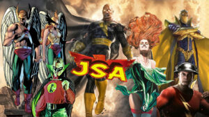 Nella storia dei fumetti DC, la JSA inizia originariamente come un’alleanza tra un insieme di supereroi della DC risalenti alla Golden Age. L’ elenco inizialmente includeva Hawkman, The Atom, Black Canary, Doctor Mid-Nite, Starman, Hourman e Wonder Woman. Dopo che, negli anni ’40, i fumetti sui supereroi hanno cominciato a perdere la loro popolarità, la JSA e i loro crossover hanno iniziato a venire meno. Successivamente i crossover sono stati riservati ad eventi particolari, che vedevano come protagonisti i supereroi della Silver Age nel super gruppo chiamato Justice League Of America. Nonostante il successo della JLA, però, i fan volevano vedere il ritorno della JSA e alla fine il loro desiderio è stato realizzato sotto forma di crossover annuali, che vedevano le due squadre unire le forze dai rispettivi universi paralleli di Terra-1 e Terra-2.