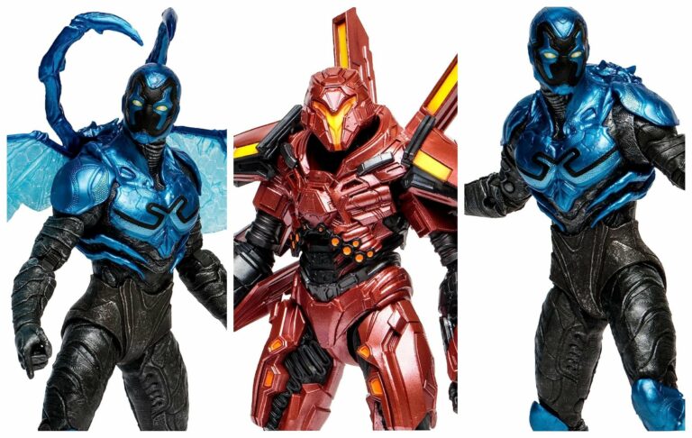 - McFarlane Toys – Figura di Blue Beetle del Multiverso DC (modalità battaglia) ($19,99 – uscita 1 agosto) Gli accessori includono mani e ali intercambiabili e una base. Include una scheda artistica.