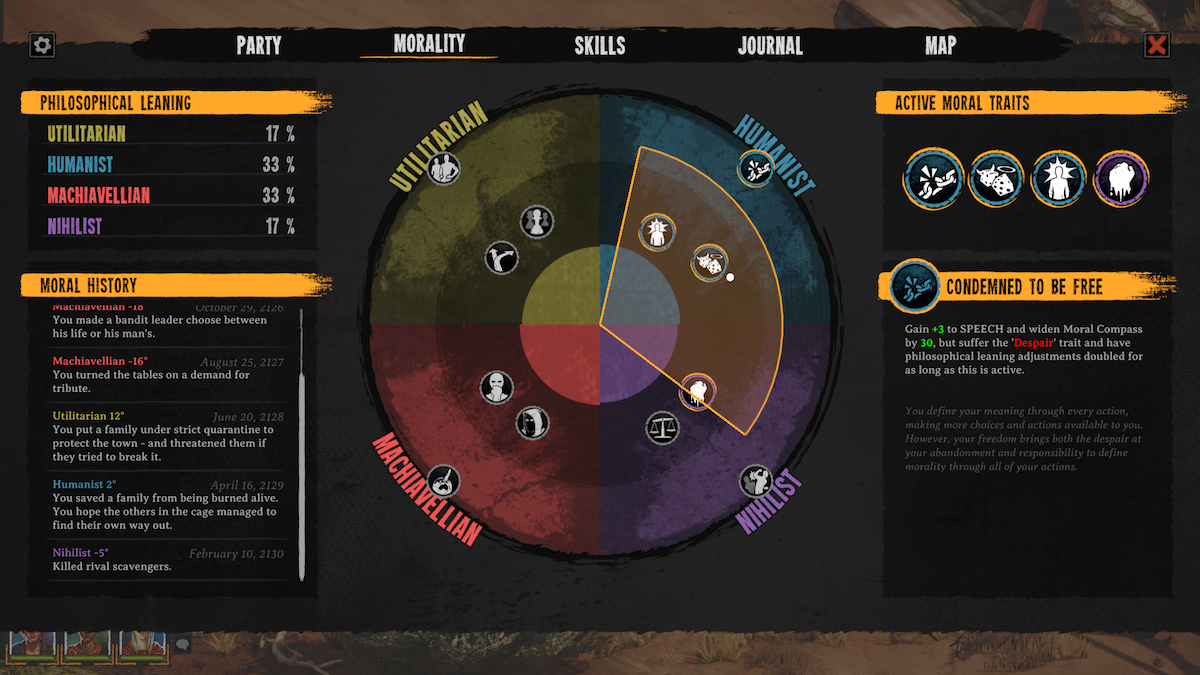 Broken Roads è un gioco di ruolo narrativo che porta l’esplorazione, il combattimento strategico a turni e scelte filosofiche significative in una nuovissima ambientazione australiana post-apocalittica. Broken Roads mescola sapientemente elementi di gioco di ruolo tradizionali e nuovi, con un sistema senza classi che offre opzioni di sviluppo del personaggio pressoché illimitate, costruite attorno a quattro filosofie: Umanista, Utilitarista, Machiavellica e Nichilista. Inoltre, il gioco presenta ai giocatori un sistema di moralità originale: la Bussola Morale, che vede le opzioni di dialogo e le decisioni relative alle missioni influenzare, ed essere influenzate, dall’inclinazione filosofica del personaggio e dalle difficili decisioni che prende lungo il cammino.