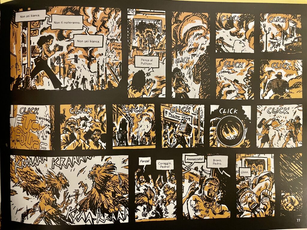 I personaggi di Burn baby burn, pur non essendo reali, sono molto realistici e perfettamente calati nella Storia, e le loro vite si intrecciano in maniera perfetta per mantenere sempre alta la suspense e il ritmo della narrazione. Il formato orizzontale è un’ottima scelta e permette a Lorenzo di giocare meglio con lo spazio e con l’occhio del lettore, che è chiamato a una lettura attenta. Le tavole sono infatti suddivise in tanti piccoli riquadri e spesso i vari personaggi si alternano anche all’interno della stessa.