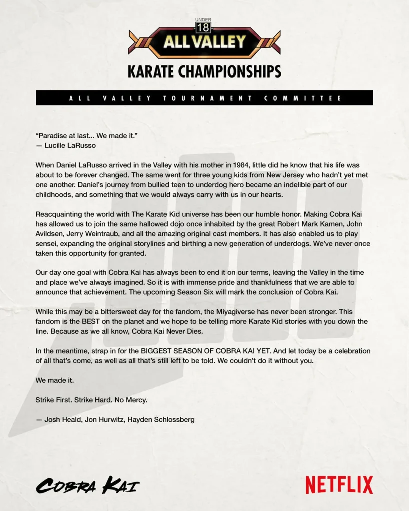 L’obiettivo di Cobra Kai è sempre stato quello di concludere il progetto alle nostre condizioni, lasciando la Valley nel momento e nel luogo che abbiamo sempre immaginato. È quindi con immenso orgoglio e gratitudine che siamo in grado di annunciare questo risultato.