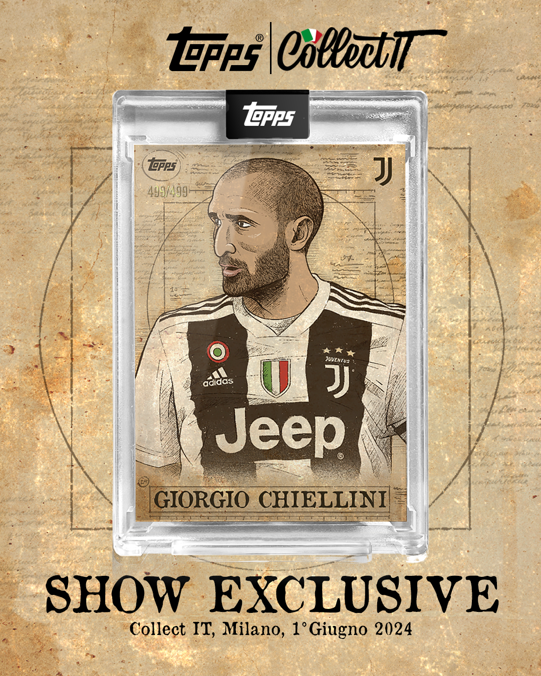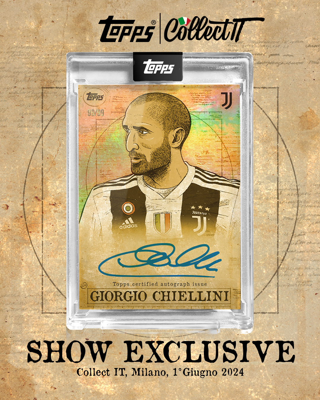 Grazie alla sua consolidata leadership nel settore, Topps coinvolgerà un ospite d’onore: Giorgio Chiellini, l’ex capitano della Nazionale italiana Campione d’Europa in carica. In programma a Collect IT un meet & greet per i fan più affezionati e una sessione di autografi davvero unica e irripetibile. Per l’occasione, infatti, Pedro Demetriou – Senior Designer Topps – ha realizzato una carta esclusiva ispirata all’uomo vitruviano: disponibile in due versioni numerate e limitate, sono destinate a diventare dei veri pezzi da collezione con un valore notevole.