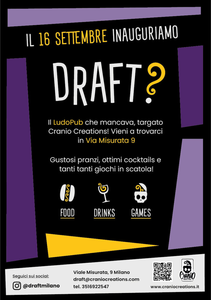 In una città piena di vita come Milano, dove l’arte, la moda e la cultura non dormono mai, si sentiva la mancanza di uno spazio dove gli amanti dei giochi in scatola potessero unire la loro passione per la strategia e l’avventura alla gioia di un pasto saporito o di una birra artigianale. Cranio Creations, la celebre casa editrice italiana di giochi, ha preso tale mancanza non come un ostacolo, ma come una sfida entusiasmante. La risposta è DRAFT?, il Ludo Pub concepito per essere il rifugio ideale per gli appassionati, gli strateghi e chiunque desideri un po’ di relax e divertimento nella frenesia urbana. Situato in Via Misurata 9, il LudoPub verrà inaugurato sabato 16 settembre, a partire dalle ore 17:00, in un evento aperto a tutti: un’ottima occasione per scoprire il locale, provare i giochi e assaporare il buffet. Non solo: per l’occasione, Cranio offrirà uno sconto del 25% sull’acquisto dei giochi disponibili nel locale!