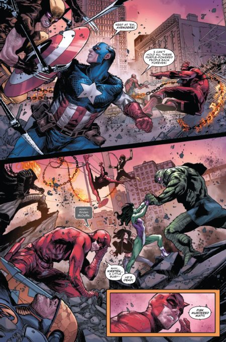 Marco Checchetto, l’artista di Devil’s Reign, ha twittato un’anteprima del numero finale che mostra il volto arrabbiato di Daredevil. Siamo nel bel mezzo di una guerra per le strade di New York City tra i Vendicatori e gli agenti controllati dalla mente dell’Uomo Viola, che ha stretto alleanza con Fisk. Mentre Capitan America combatte versioni di realtà alternative di Otto Octavius e Luke Cage, l’ex fidanzata di Matt Murdock, Kristen McDuffie, lo informa che Fisk ha brutalmente ucciso Mike, il gemello di Matt. Scosso da questa rivelazione, Daredevil si lancia nella mischia, fiducioso che il suo nemico di lunga data non sopravviverà al loro prossimo incontro.