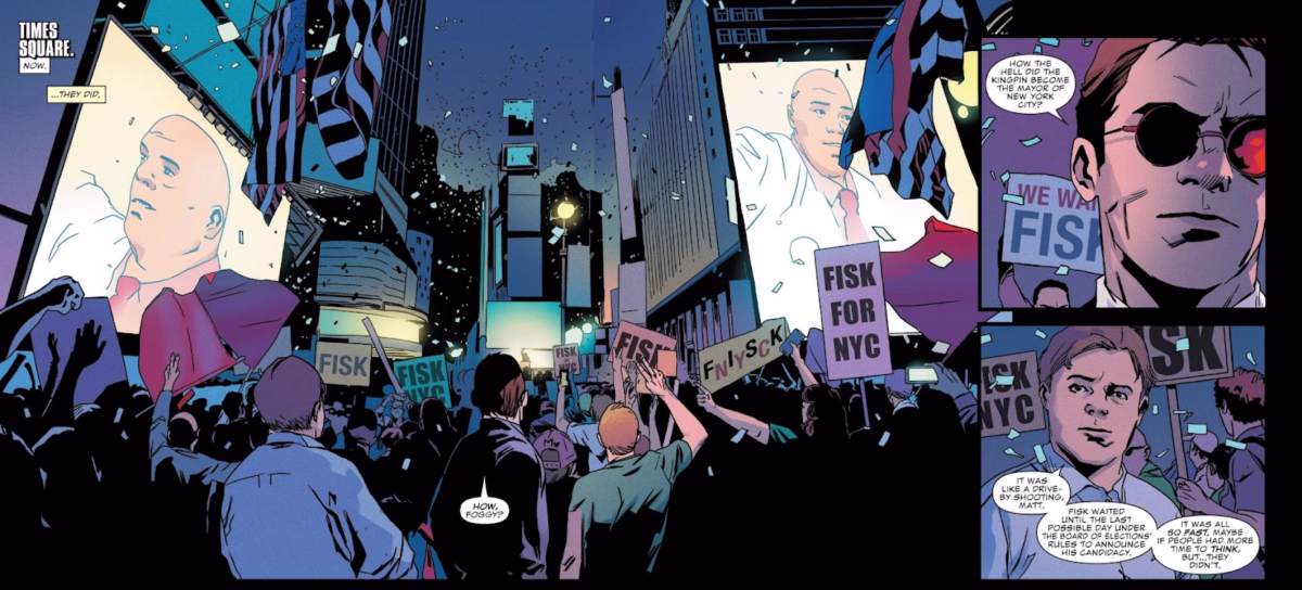 La scena di Capodanno del trailer ricrea le pagine di Daredevil #595, che vedono Matt chiedere a Foggy Nelson: “Come diavolo ha fatto Kingpin a diventare il sindaco di New York?”.