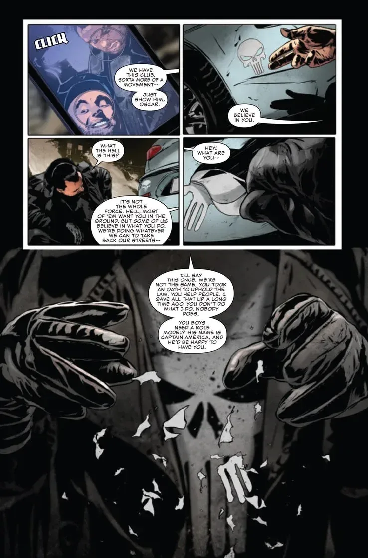 In Punisher #13, lo scrittore Matthew Rosenberg e l’artista Szymon Kudranski hanno affrontato direttamente il fenomeno reale dell’adozione del simbolo del teschio del Punitore da parte delle forze dell’ordine. In una scena di grande impatto, Frank incontra degli agenti di polizia che esprimono ammirazione per i suoi metodi, uno dei quali mostra addirittura un adesivo con il teschio del Punitore sulla sua auto di pattuglia. La risposta di Castle è immediata e inequivocabile:
