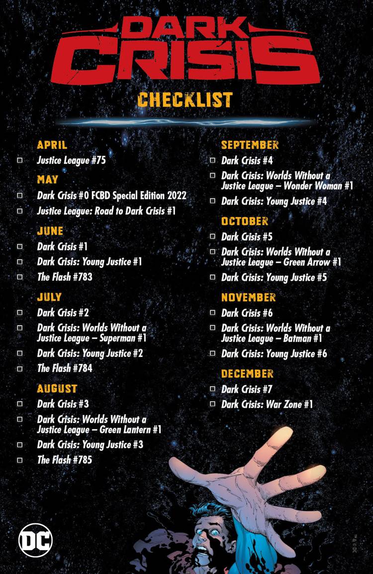 La serie di One-Shot prende il via a luglio con Dark Crisis: Worlds Without a Justice League – Superman #1 di Tom King e Chris Burnham, con una storia backup di Aquaman di Brandon Thomas e Fico Ossio. Dark Crisis: Worlds Without a Justice League – Green Lantern #1 segue in agosto, scritto da Phillip Kennedy Johnson e disegnato Fernando Blanco, con una backup di Hawkgirl della scrittrice Nadia Shammas e dell’artista Jack Herbert.