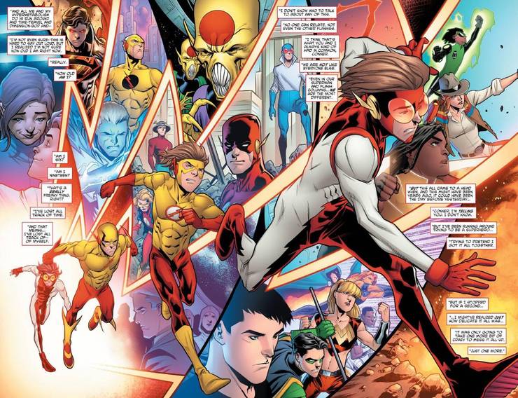 L’epica tavola raffigura la sua giovinezza precedente agli anni da supereroe, l’imponente Superboy-Prime, cattivi come i Dominatori, i suoi compagni di squadra nei Teen Titans, e la famiglia Flash originale composta da Barry Allen, Jesse Quick, Max Mercury e Jay Garrick. Nel processo, il costume di Bart cambia, rappresentando varie epoche della sua storia fumettistica.