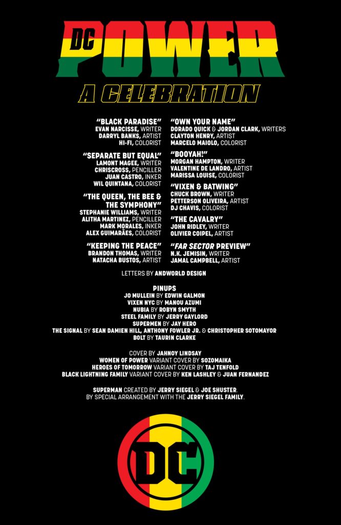 DC Power: A Celebration presenta contributi di Evan Narcisse, Darryl Banks, Hi-Fi, Lamont Magee, ChrisCross, Juan Castro, Wil Quintana, Stephanie Williams, Alitha Martinez, Mark Morales, Alex Guimarães, Brandon Thomas, Natacha Bustos, Dorado Quick, Jordan Clark, Clayton Henry, Marcelo Maiolo, Morgan Hampton, Valentine De Landro, Marissa Louise, Chuck Brown, Petterson Oliveira, DJ Chavis, Ridley, Olivier Coipel, N. K. Jemisin, Jamal Campbell e AndWorld Design. Le copertine sono di Jahnoy Lindsay e le variant cover di Sozomaika, Taj Tenfold, Ken Lashley e Juan Fernandez. Il one-shot esce il 31 gennaio 2023 negli U.S.A.