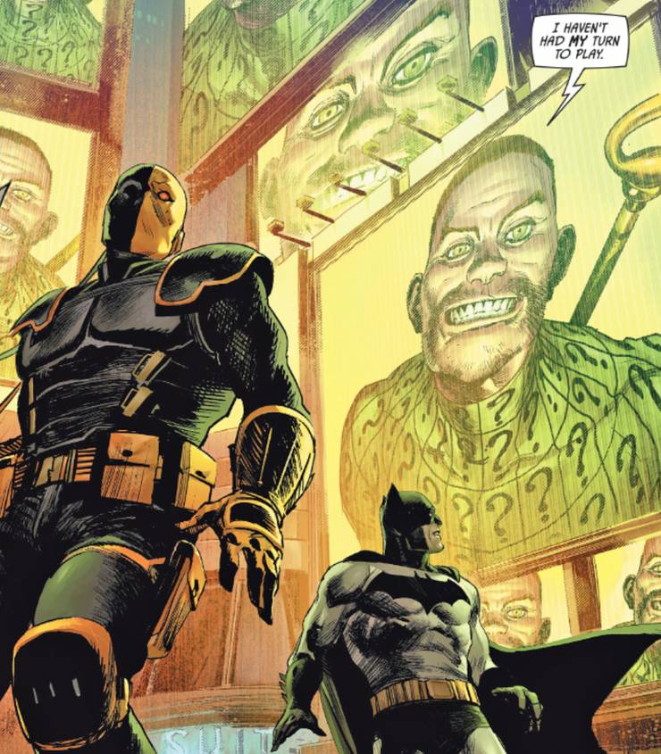 Non appena il Designer finisce di parlare, i suoi sgherri simili a degli zombie circondano sia Batman che Deathstroke, e l’Enigmista annuncia di essere in combutta con il Designer.