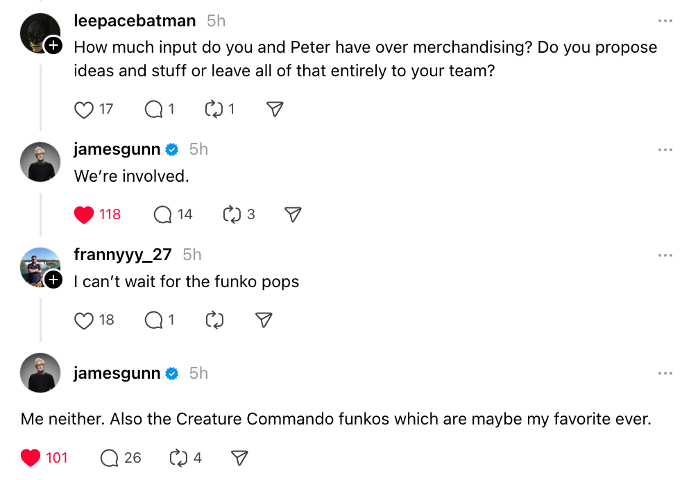 In alcuni recenti commenti su Threads, Gunn ha confermato che lui e Safran sono “coinvolti” nel merchandising dell’Universo DC e ha risposto al commento di un fan che si diceva entusiasta dei Funko Pop di Superman con “Anche io. Anche per i Funko di Creature Commandos, forse i miei preferiti in assoluto”.