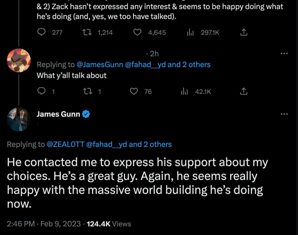 Un utente di Twitter ha postato una risposta alla foto di Gunn facendo riferimento all’hashtag “Sell SnyderVerse to Netflix”, una campagna online per far sì che la versione di Snyder del DCEU continui su Netflix. Gunn è stato spinto a fermarsi e a parlare di “#SellSnyderverseToNetflix”, fornendo ai fan della DC una breve, logica (e tagliente) spiegazione del perché non accadrà mai. Come nota a margine, Gunn ha anche fatto sapere che “Zack non ha espresso alcun interesse e sembra essere felice di fare quello che sta facendo (e, sì, anche noi abbiamo parlato)”.