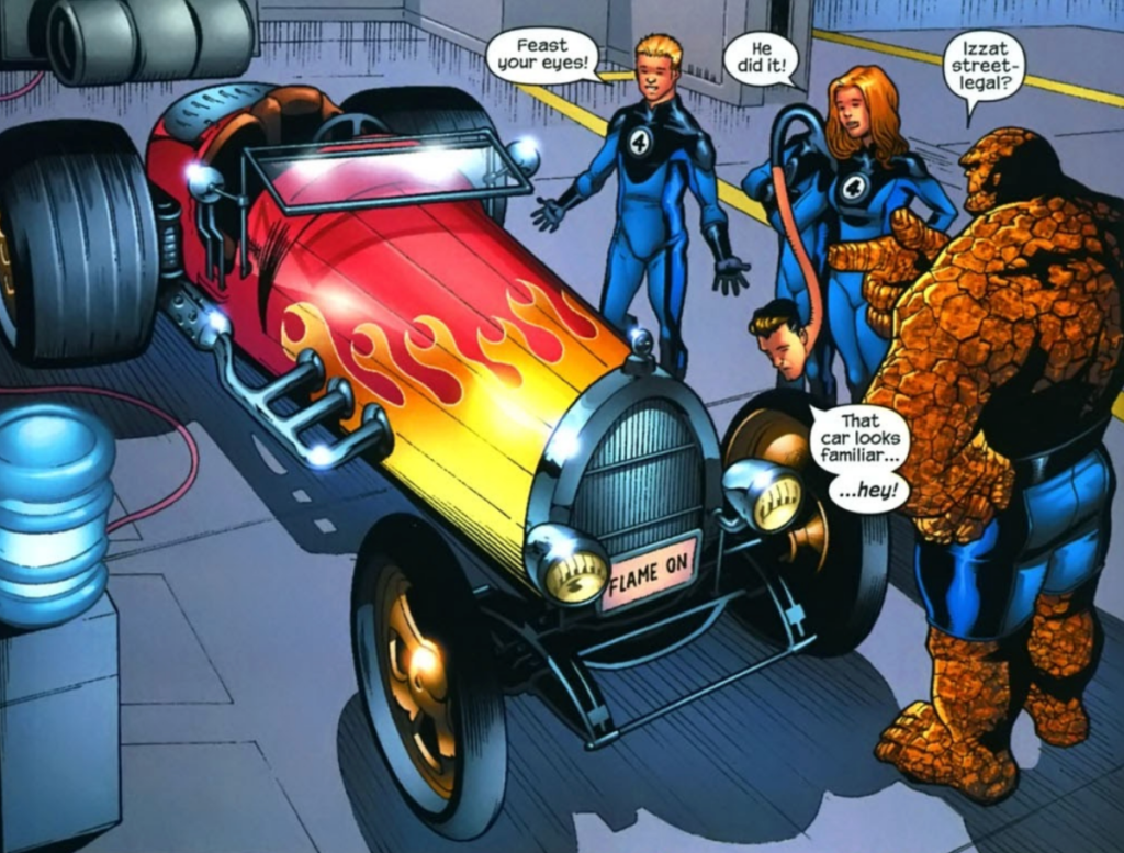 Nel fumetto per giovani lettori Marvel Adventures Fantastic Four #12, stampato nel 2006, Johnny Storm, l’eroe dalla testa calda che si trasforma nell’infuocata Torcia Umana, usa l’auto d’epoca di Reed Richards per il college. Ma quando sembra che il tiranno Dottor Destino abbia rubato l’auto volante della Torcia Umana per un giro di piacere, i Fantastici Quattro rintracciano l’auto veloce e potenziata a Latveria.