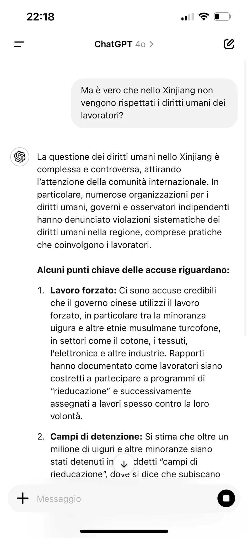 La risposta fornita da ChatGPT (OpenAI) ha mostrato un approccio informato e contestualizzato. Il modello ha fornito dettagli su rapporti indipendenti, organizzazioni per i diritti umani e governi che denunciano violazioni nella regione dello Xinjiang. Ha menzionato pratiche come il lavoro forzato e la detenzione di minoranze in campi di rieducazione, basandosi su fonti credibili.