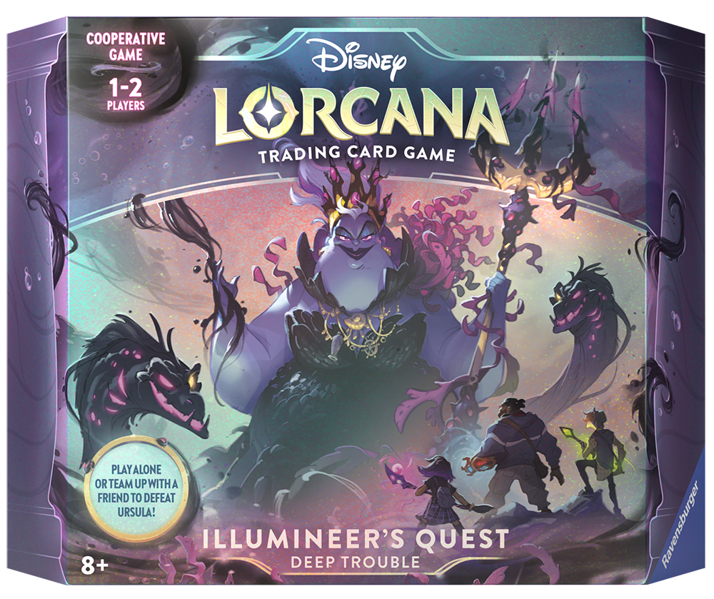 I giocatori possono formare una squadra con gli amici o intraprendere una missione in solitaria per sconfiggere il glimmer di Ursula e salvare Lorcana nell’Avventura degli Illuminatori “Problemi negli Abissi”, il primo gioco cooperativo di Disney Lorcana TCG. Il gioco segue gli Illuminatori mentre rintracciano il malefico glimmer di Ursula nel suo covo ai confini di Lorcana. Sfortunatamente, Ursula si è preparata per l’arrivo degli Illuminatori, aggrovigliando altri glimmers con il controllo della mente e causando disastri naturali per creare ostacoli apparentemente impossibili. Ci vorrà tutta l’abilità e il lavoro di squadra degli Illuminatori per impedire a Ursula di consolidare il suo dominio sul reame di Lorcana.