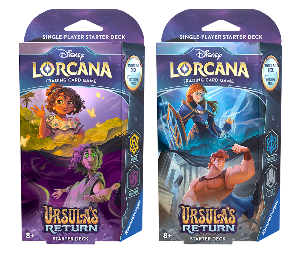 Il set Il Ritorno di Ursula di Disney Lorcana TCG includerà due Starter Deck con combinazioni di carte Ametista e Ambra o di Zaffiro e Acciaio (€19,90) e bustine (€5.99). Saranno anche disponibili un nuovo Forziere dell’Illuminatore (€54,90) e accessori di gioco, tra cui bustine protettive (€9.99), deck box (€5,99) e tappetini da gioco (€19.99). Tutte le carte di questo set possono essere usate per personalizzare o aggiornare mazzi esistenti di Disney Lorcana TCG o per giocare assieme ai set usciti in precedenza, Capitolo Primo, L’Ascesa degli Imbevuti e Nelle Terre d’Inchiostro.