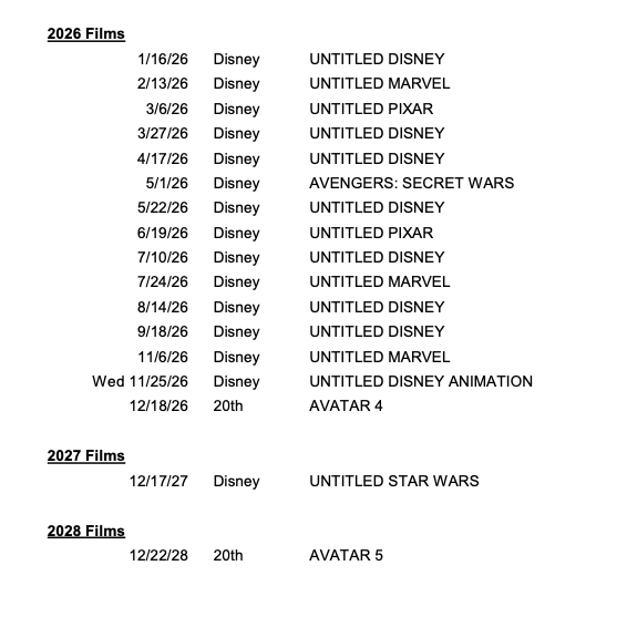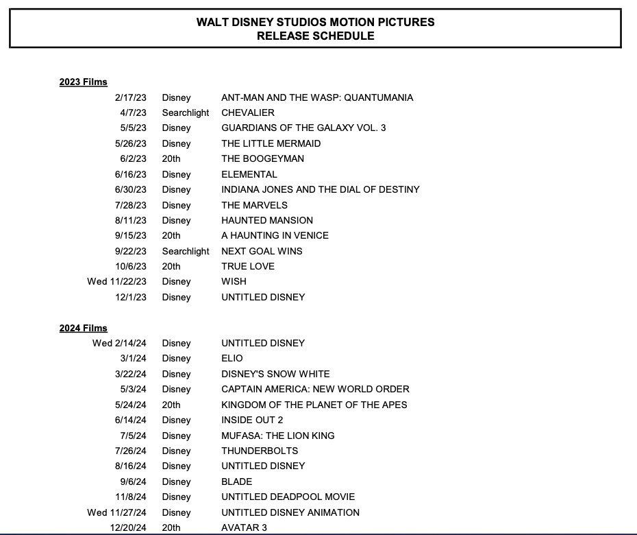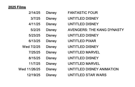 Molte delle voci qui presenti non sono nuovi annunci, anche se l’inclusione di The Boogeyman riflette la recente notizia che l’adattamento horror di Stephen King sta passando da Hulu a un’uscita nelle sale. Secondo la prassi comune della Disney, l’elenco include diversi film “senza titolo“, che specificano solo di quale franchise faranno parte. A partire dal 2025, la maggior parte dei film sono progetti Marvel, Pixar o Disney senza titolo, anche se Fantastic Four, Avengers: The Kang Dinasty, Avengers: Secret Wars e i lontani sequel di Avatar sono etichettati.